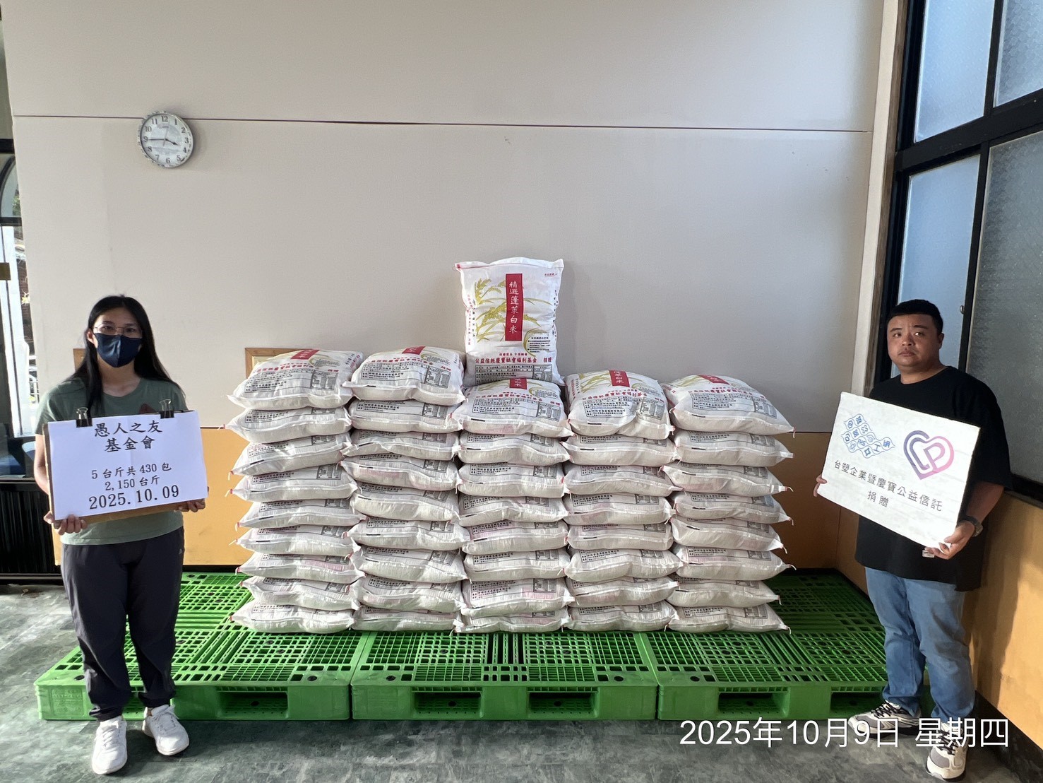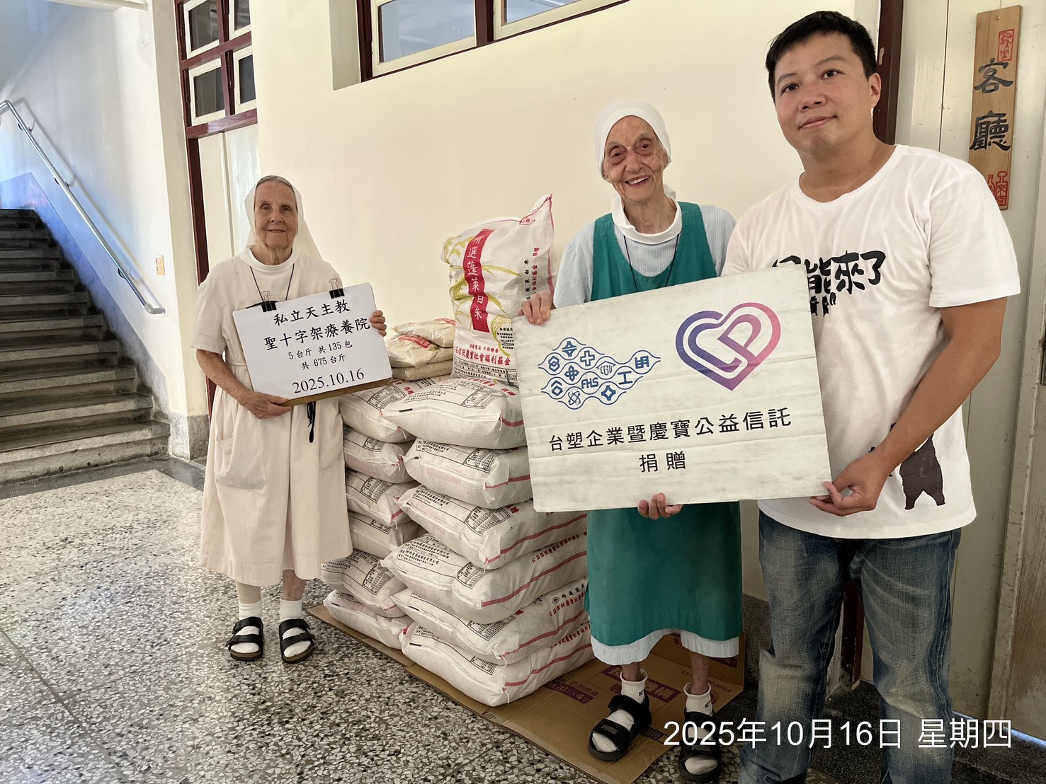 慶寶公益信託 2025年10月份捐贈白米108,225台斤、日用品362箱,總金額349萬元。
